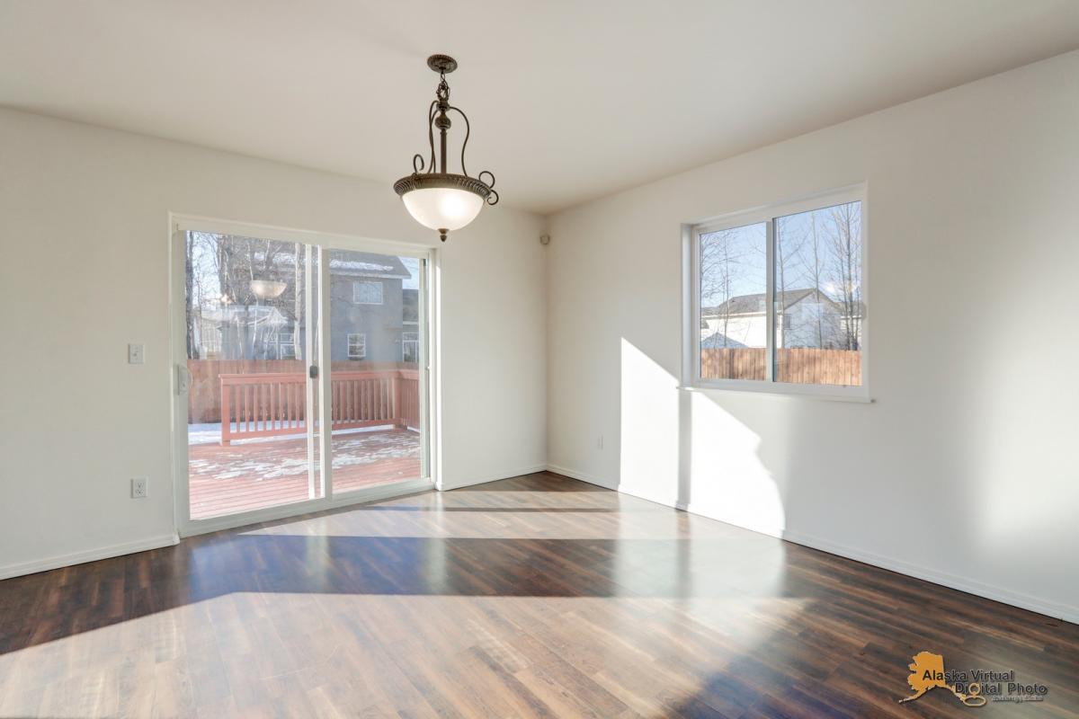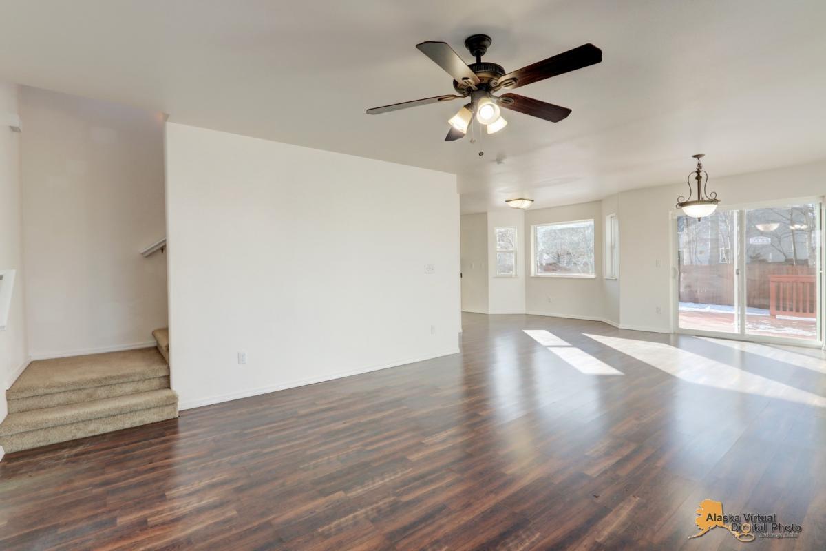 The house has a two car garage and a big fenced-in backyard with a very large deck. The first story has the kitchen, pantry, 1/2 bath, dining and living rooms.