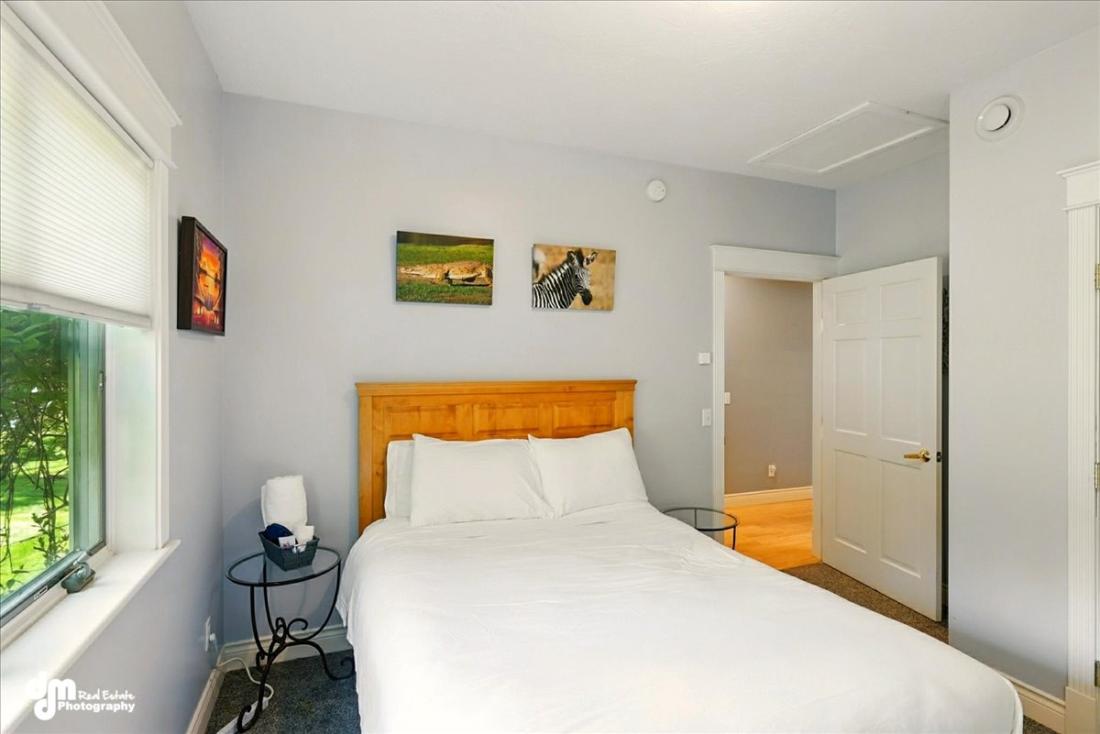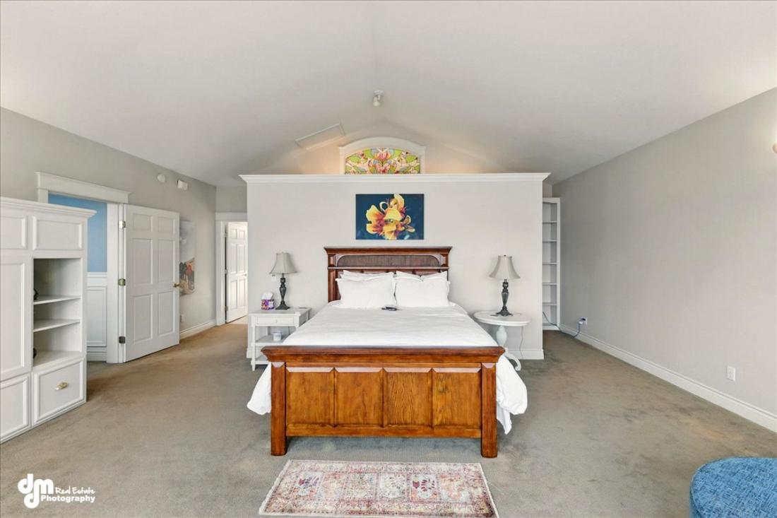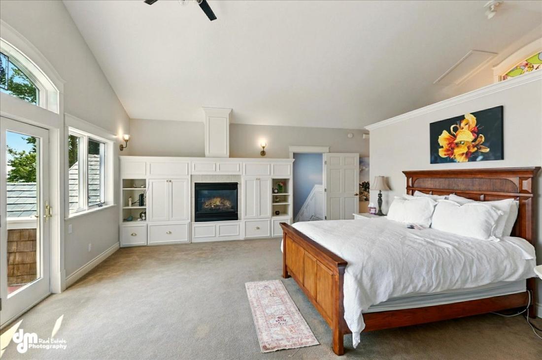 The upper-level primary suite provides a private retreat, featuring vaulted ceilings, a gas fireplace, walk-through closet, and a spa-inspired bathroom with a jetted soaking tub. A private balcony offers sweeping views across the bay, creating a truly memorable setting.