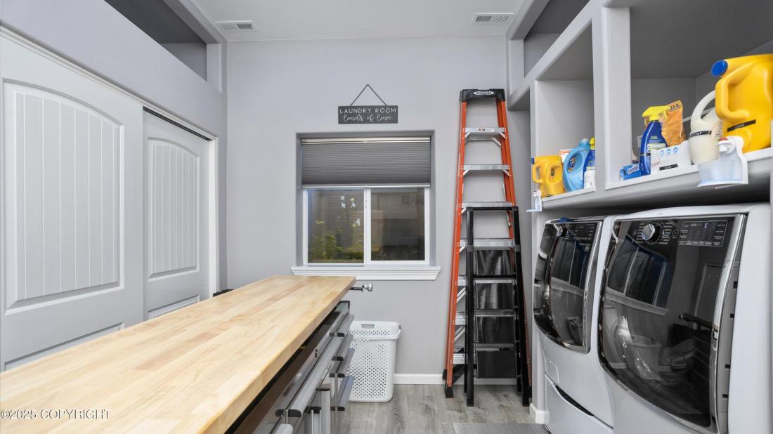 Designed with convenience and efficiency in mind, the home boasts central air conditioning—a rare feature in Alaska—along with high-end blackout blinds, LifeProof luxury vinyl plank flooring throughout, and brand-new carpeting on both sets of stairs.
