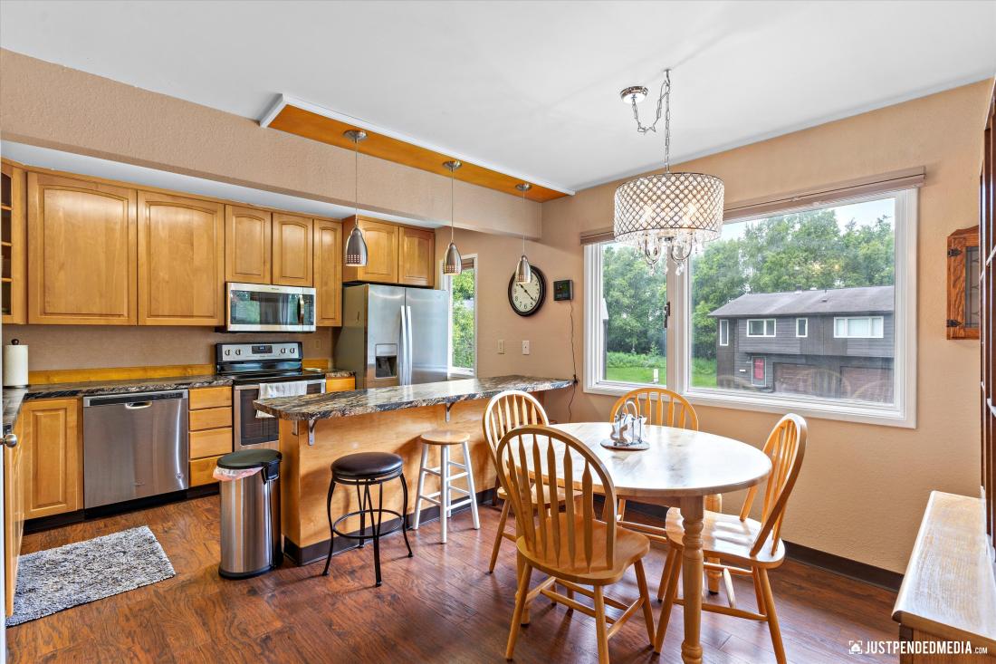 This well-designed residence features three spacious bedrooms and two bathrooms—one full and one with a shower—perfect for families or a home office. Inside, thick maple wood laminate flooring creates a cozy atmosphere. The open floor plan connects the living room, dining area, and kitchen, ideal for daily living and entertaining.